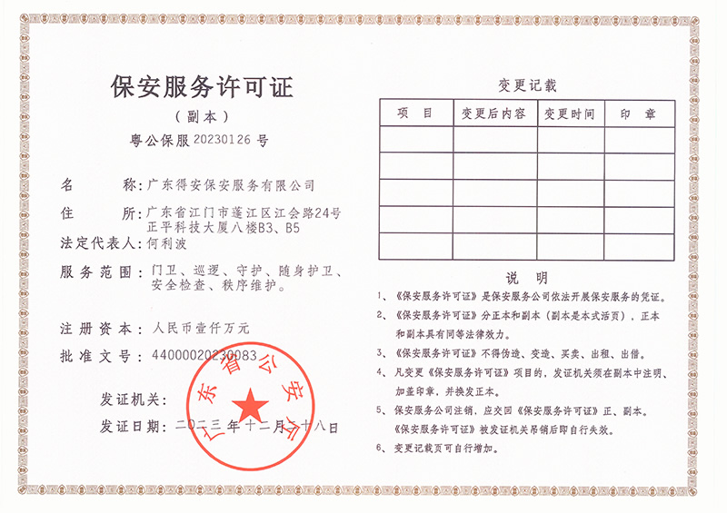 廣東得安保安服務有限公司東莞黃江分公司是一家專業化的保安公司,為東莞市黃江鎮提供專業的黃江保安服務、臨時保安勤務、特保護衛、安全技術防范等服務,先服務后收費!。